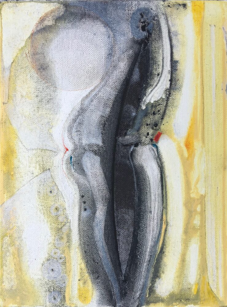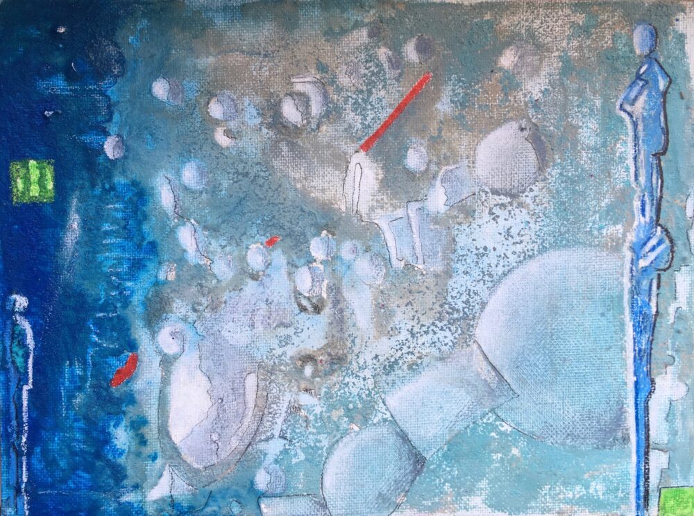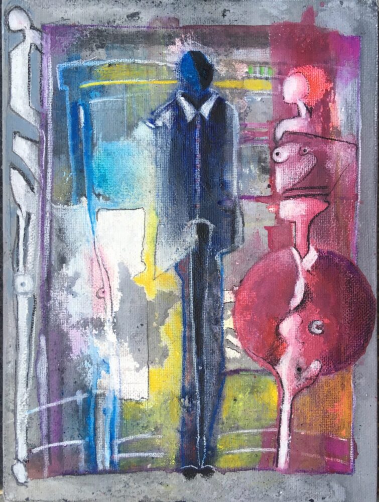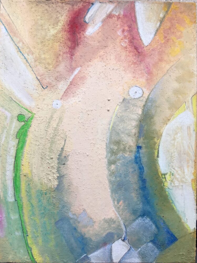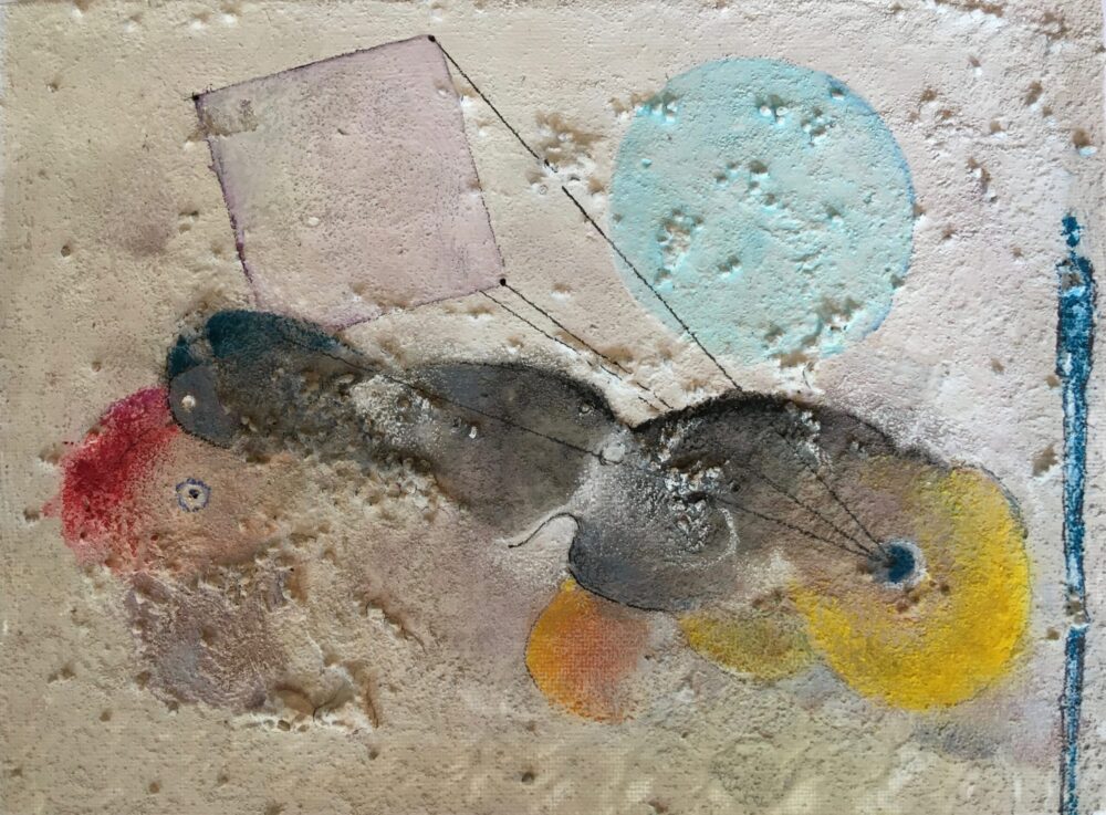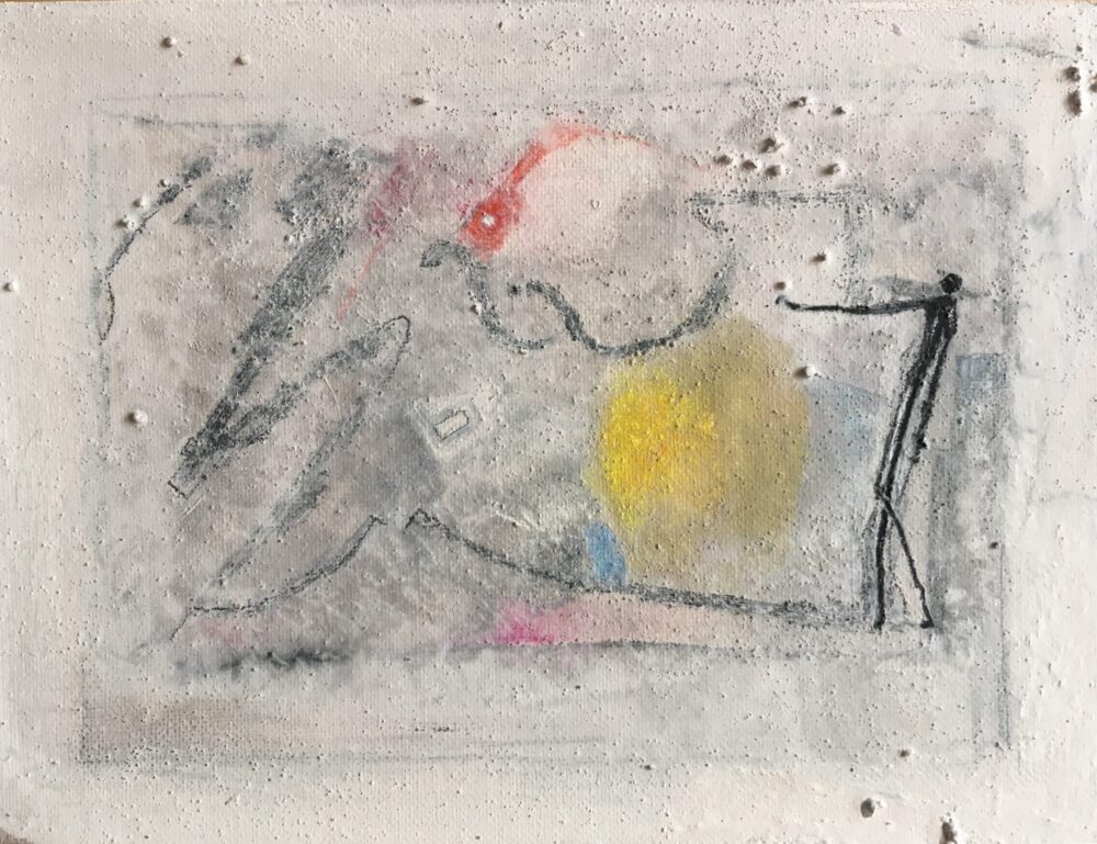 Miniatur ohne Titel Nr. 130 (Baby, heute gibt es Fisch) 24 x 18 cm Mit Beton grundiert. Acryl, Pigmentfarben auf Malpappe Burgfestspiele Bad Vilbel 2019