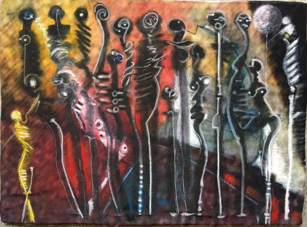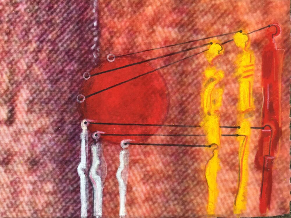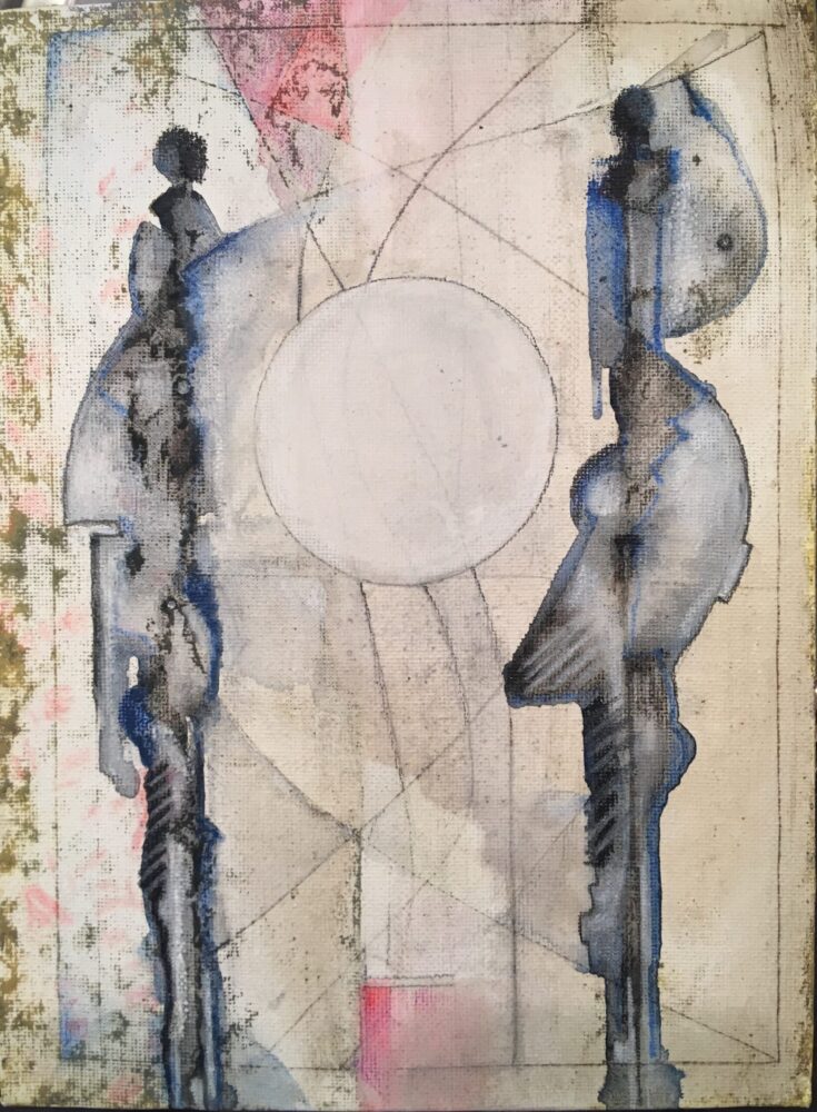 NIDDOISE 30 Vor der Premiere heute. Schließe ich den Bogen meiner Proben Bilder. 2019 24 x 18 cm Malpappe. Acryl u Pigmentfarben. Kreide. Kohle