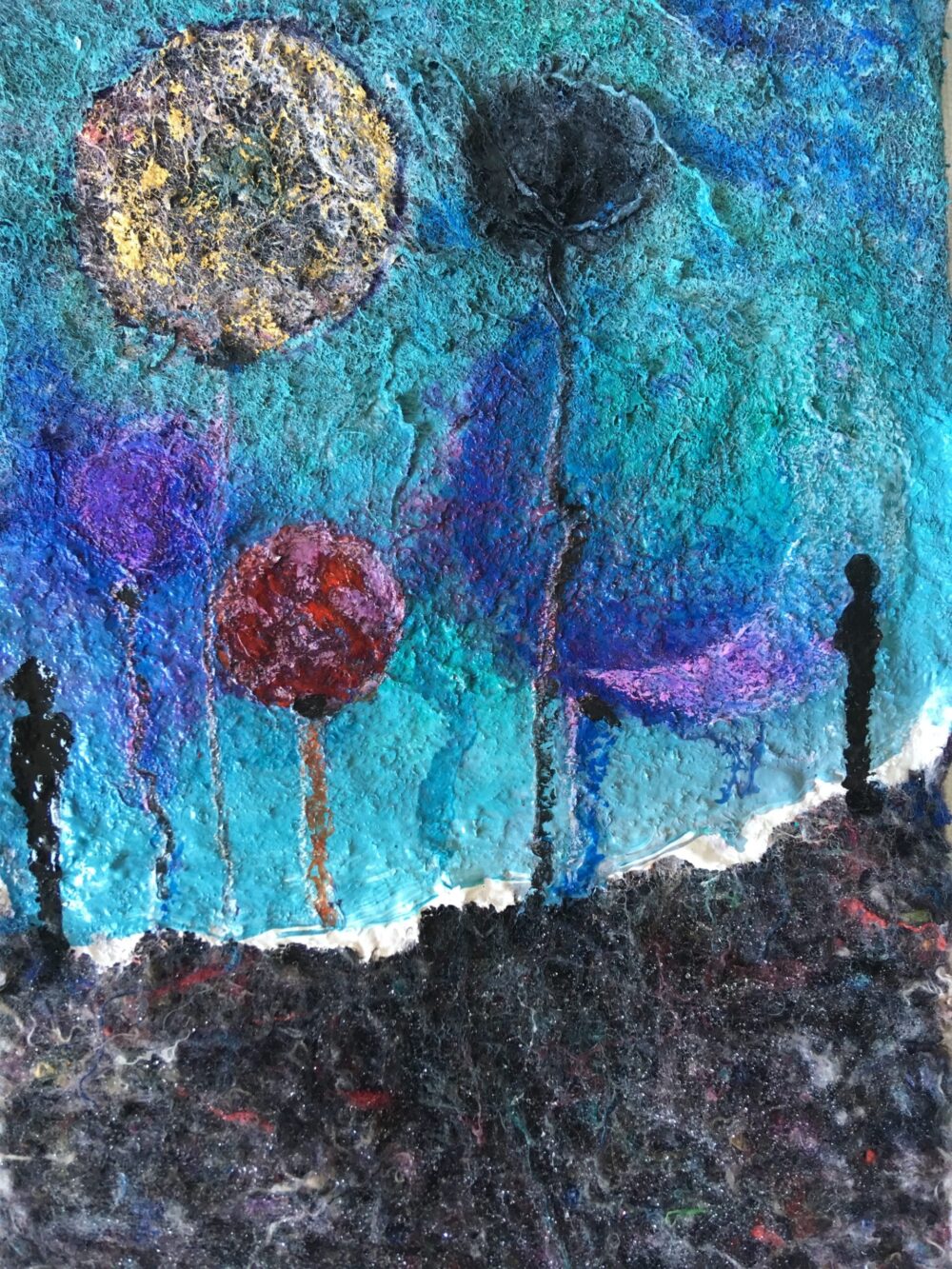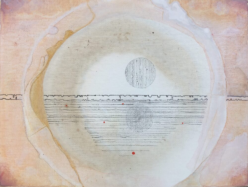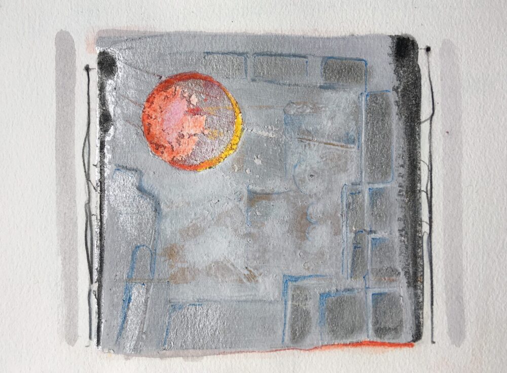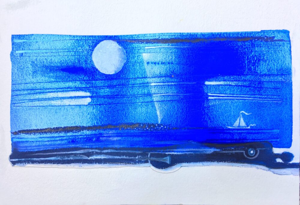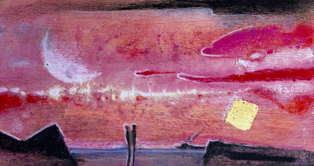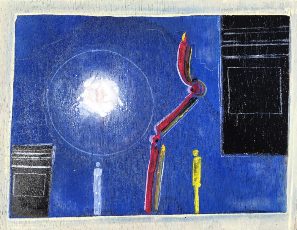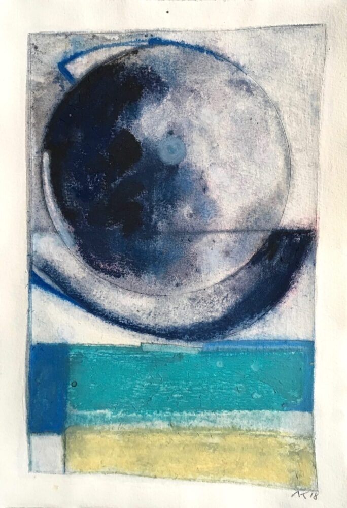 Traködie Nr. 19 10 x 15 cm klassisches Postkarten Format. Acryl, Spachtelmasse, Pigmentkreide und Gouache auf Malpappe. Schlaflose Voll – Mondnacht.