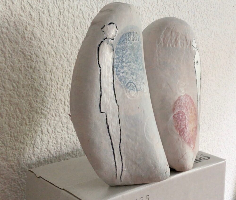 Traködie Nr. 26 Ich habe mir Schuhe gekauft. Im Innern waren jeweils Schuhspanner Größe 41 aus Pappe. Pastellgrundierung, Pigmentstifte und zusammen geklebt auf Original Schuhschachtel.