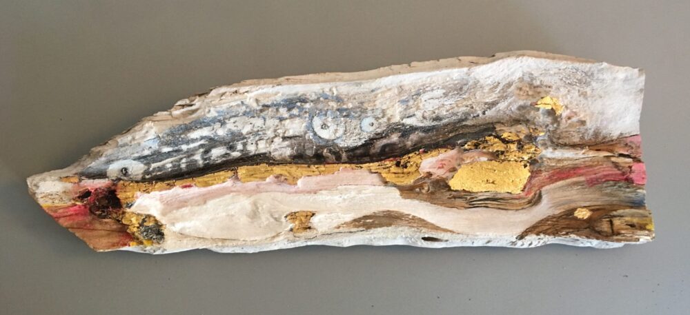 Traködie Nr. 12 Blattgold Acryl, Pigmentstifte und Gouache geritzt und geschnitten. Auf Holz am Wegrand.