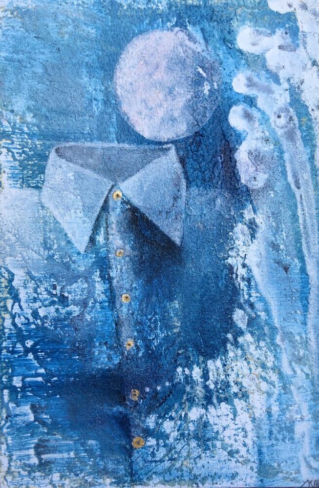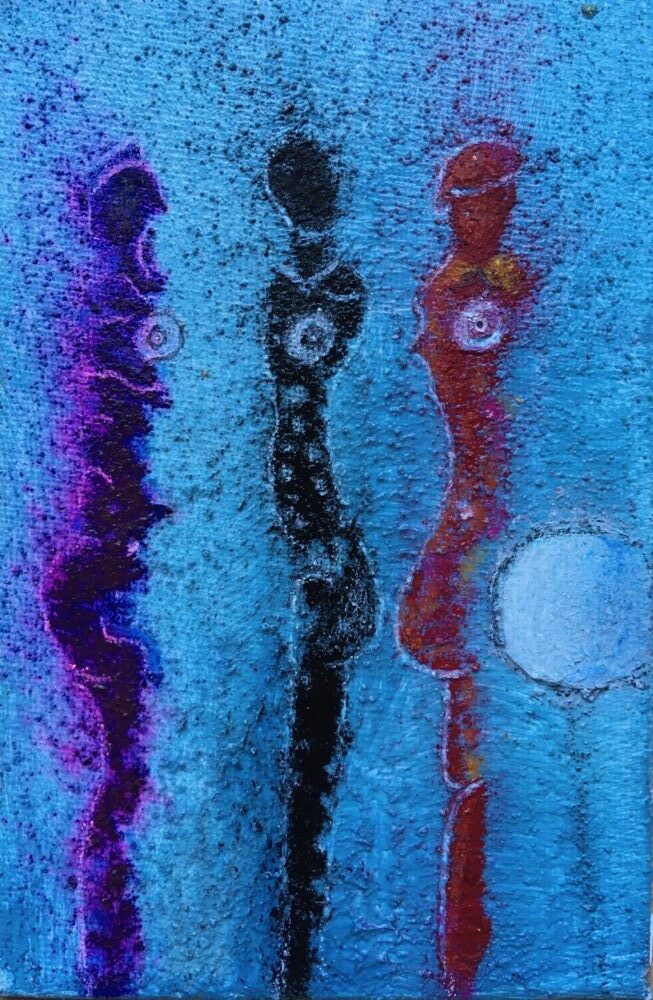 Traködie Nr. 11 Spachtelmasse mit Acryl, Pigmentstifte und Gouache auf eine Malpappe 18 x 13 cm.