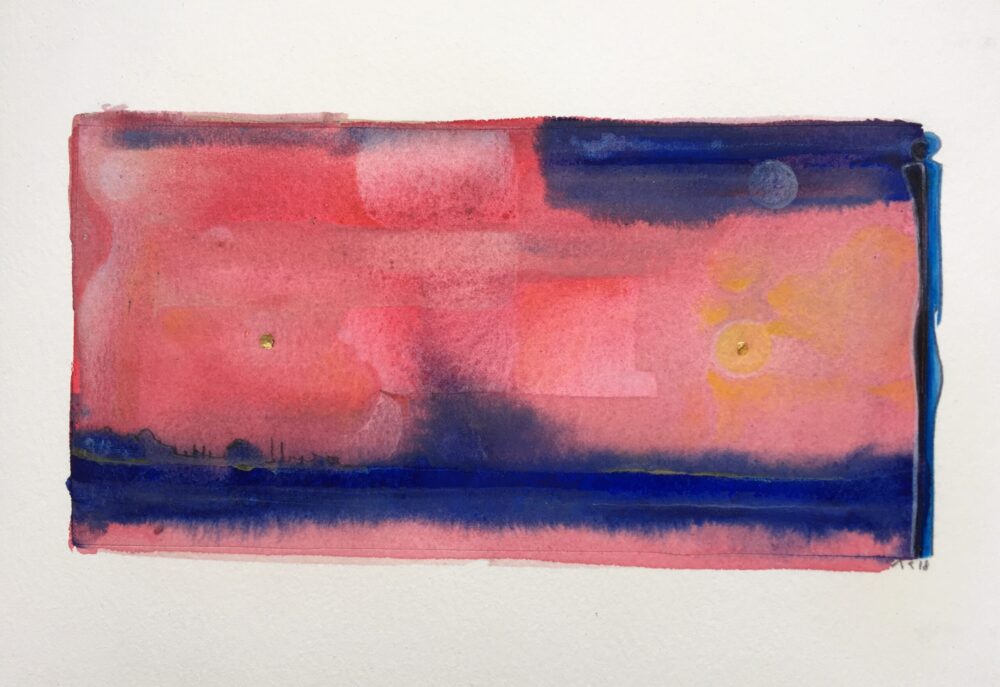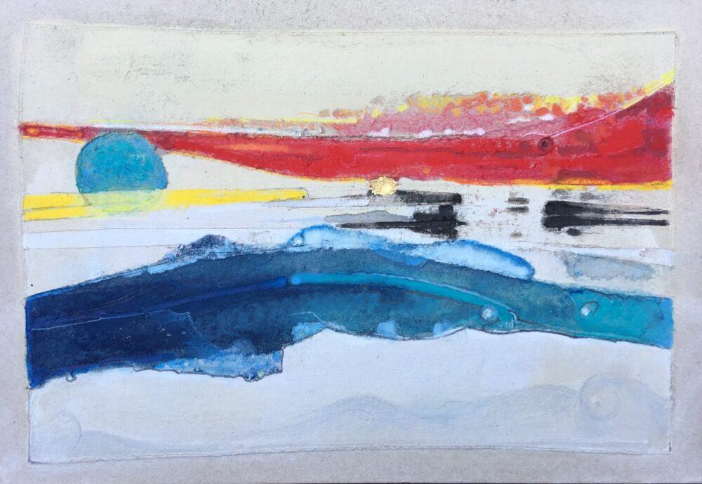 Traködie Nr. 42 Malpappe, darauf Spachtelmasse mit Pastellgrundierung, Pigment und Acrylfarben und Blattgold. 18 x 26 cm