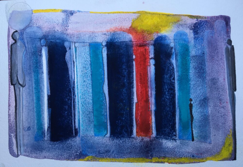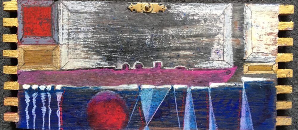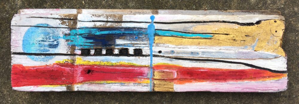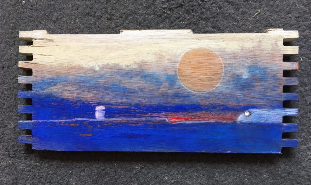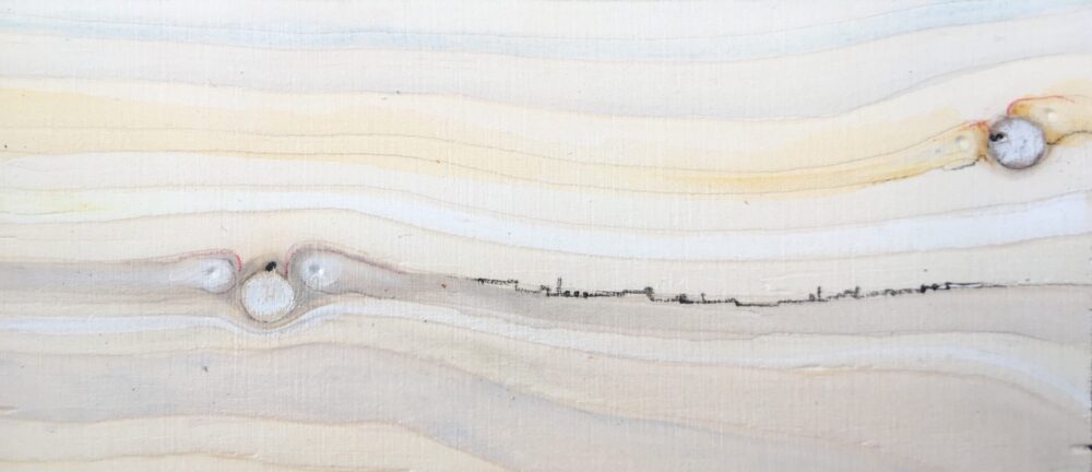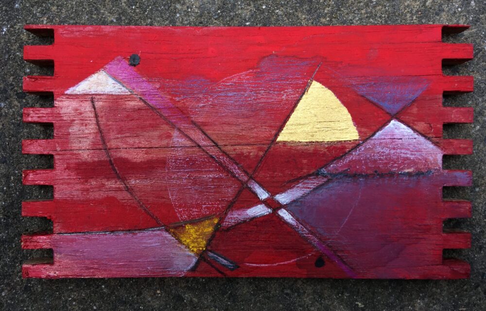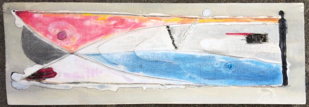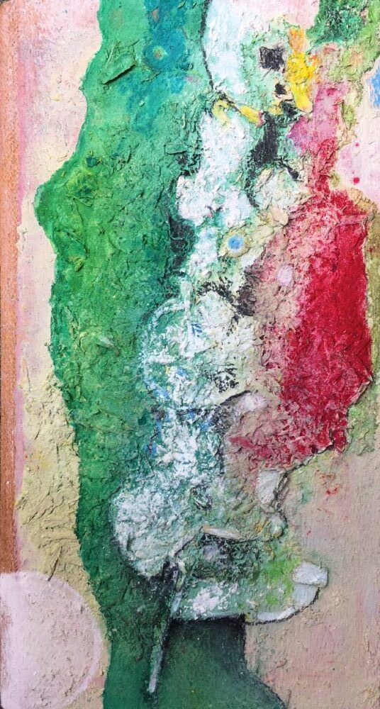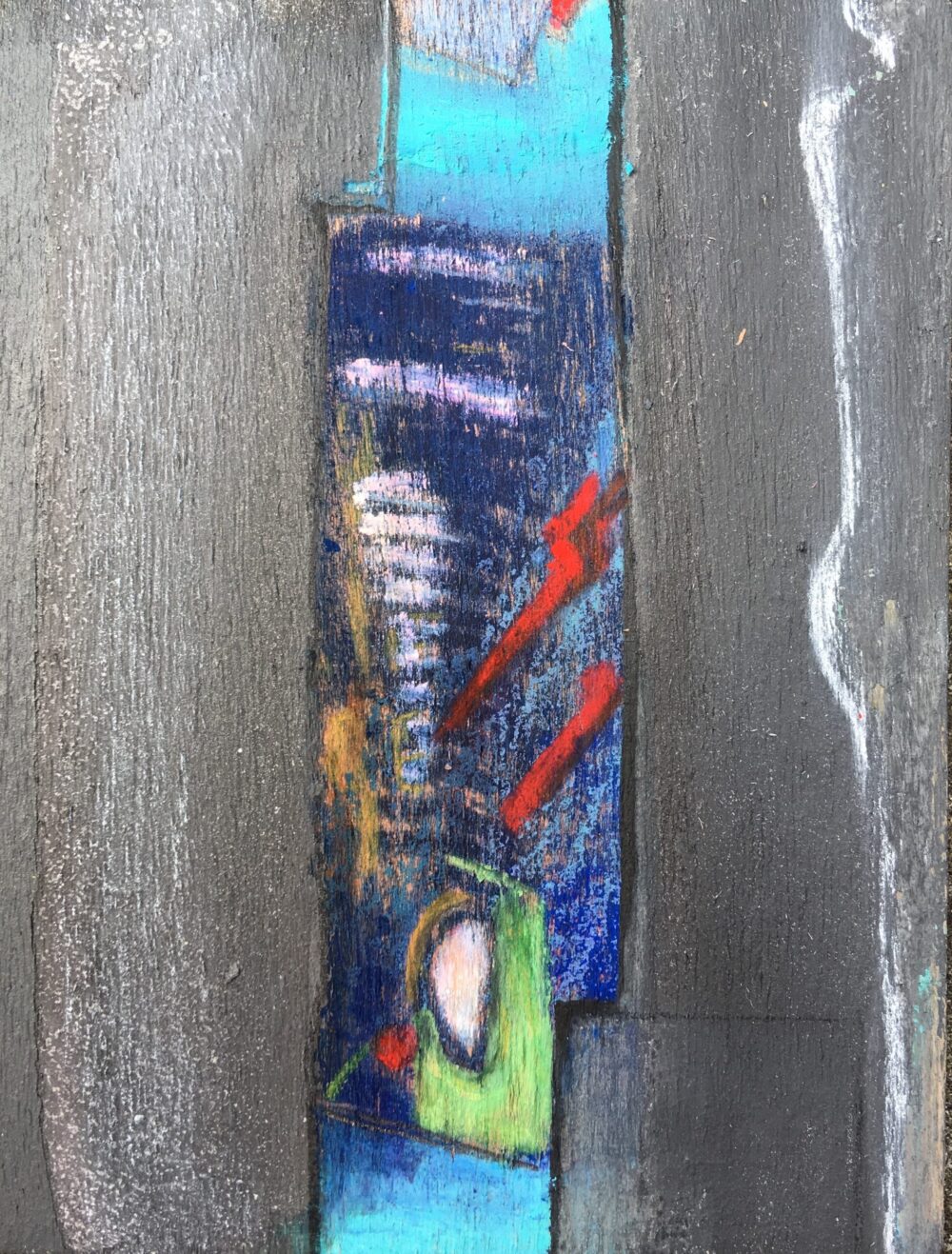 Traködie Nr. 27 Pastellgrund, Acryl, Pigmentstifte auf Holz. 17 x 7 cm