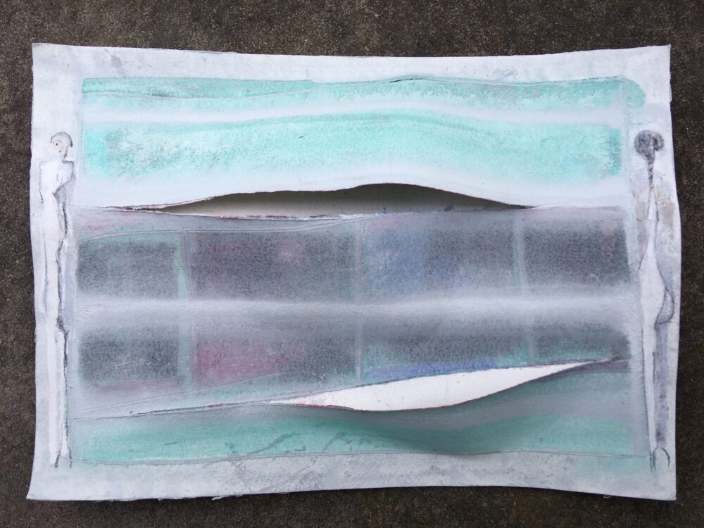 Traködie Nr. 20 Pastelmasse gespachtelt, Gouache, Pigmentkreide auf schwerem, doppelt verklebtem Büttenpapier, aufgeschnitten, gekerbt und gekratzt. 26 x 18 cm