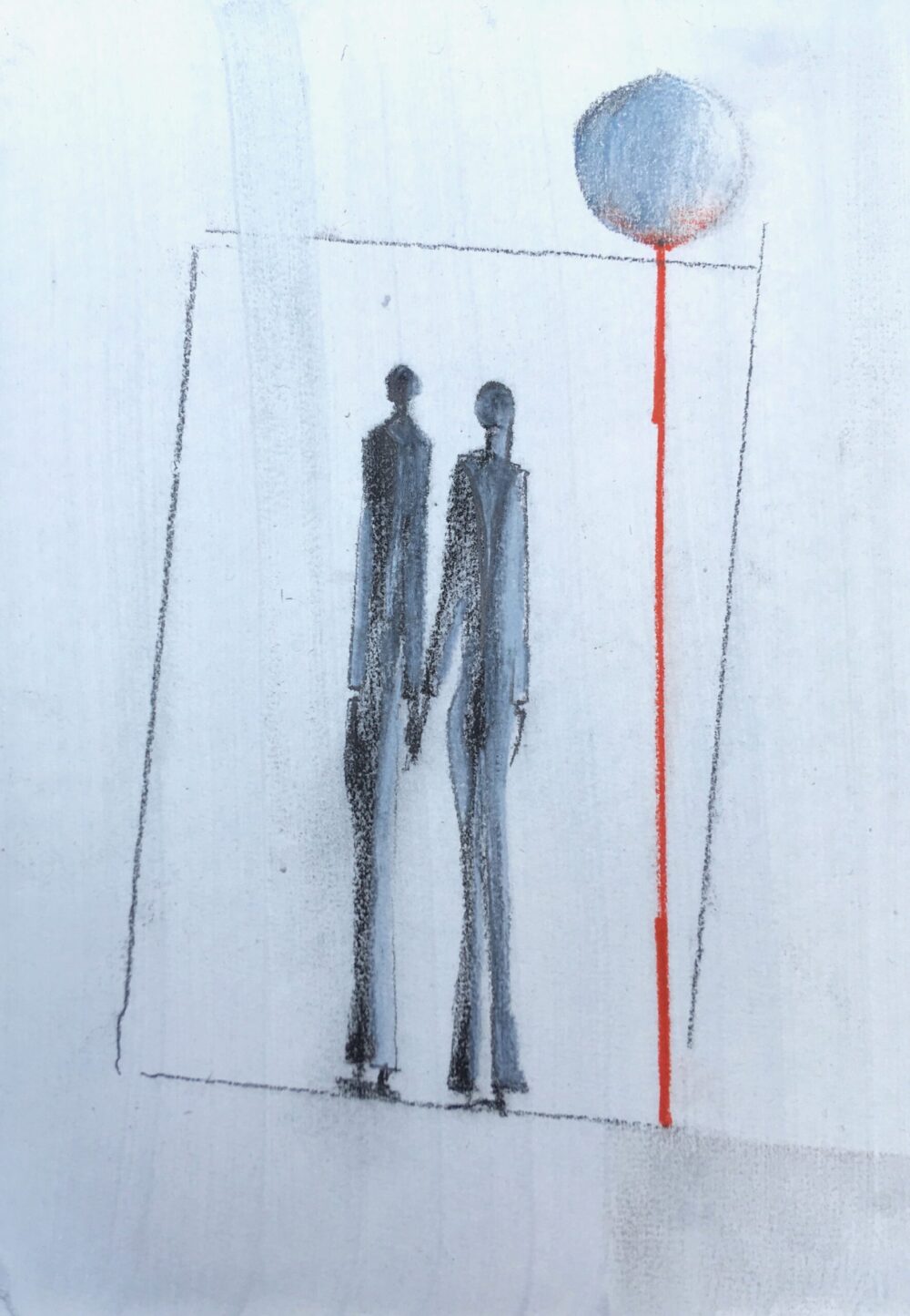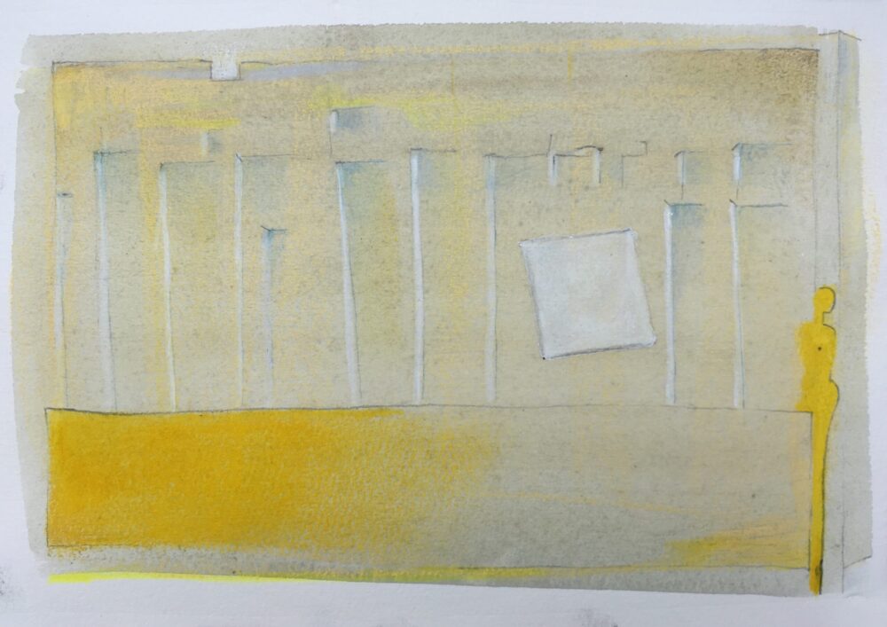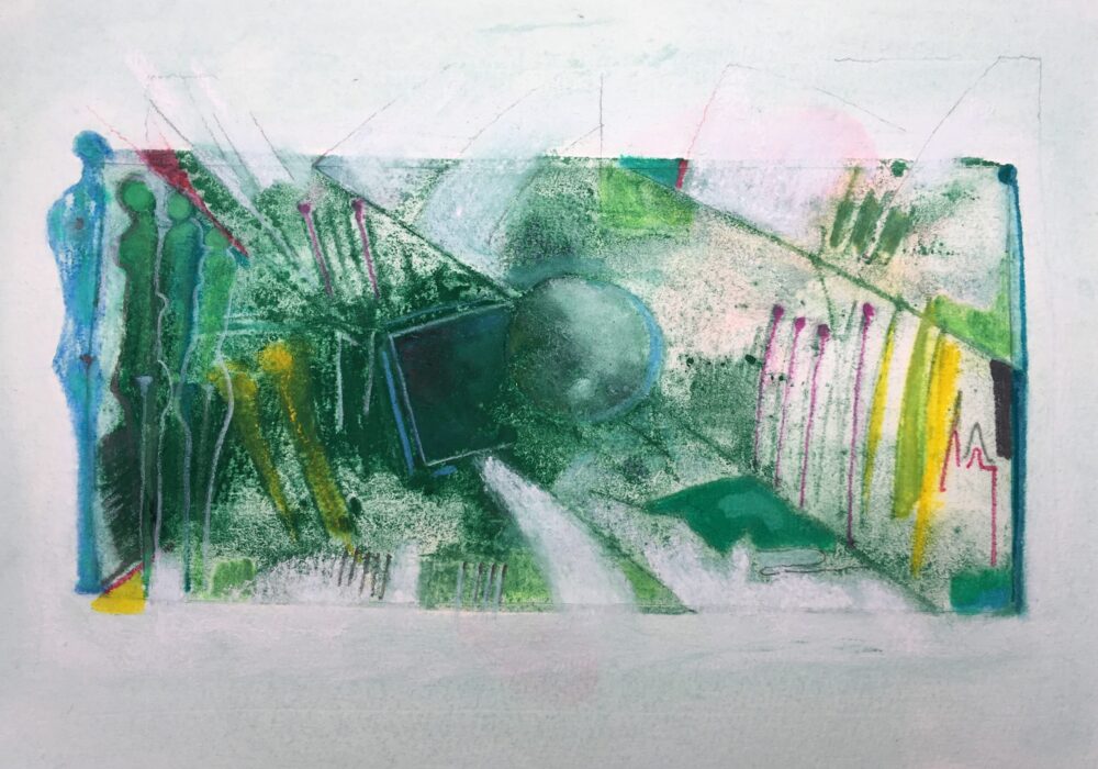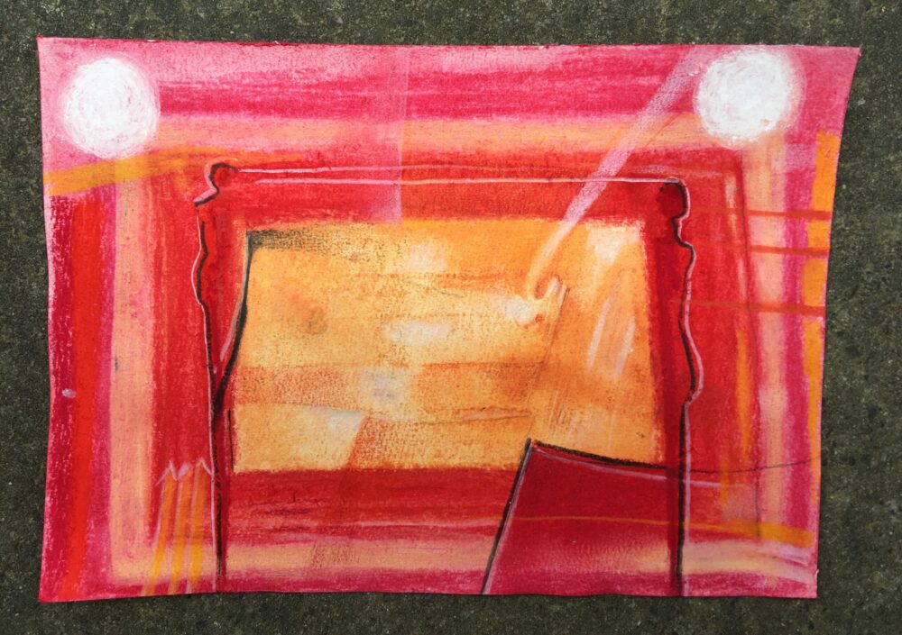 Traködie Nr. 30 Klassisches Postkarten Format. Pastellgrundierung mit Gouache und Farbstiften und Bleistift. Pigmentkreide.