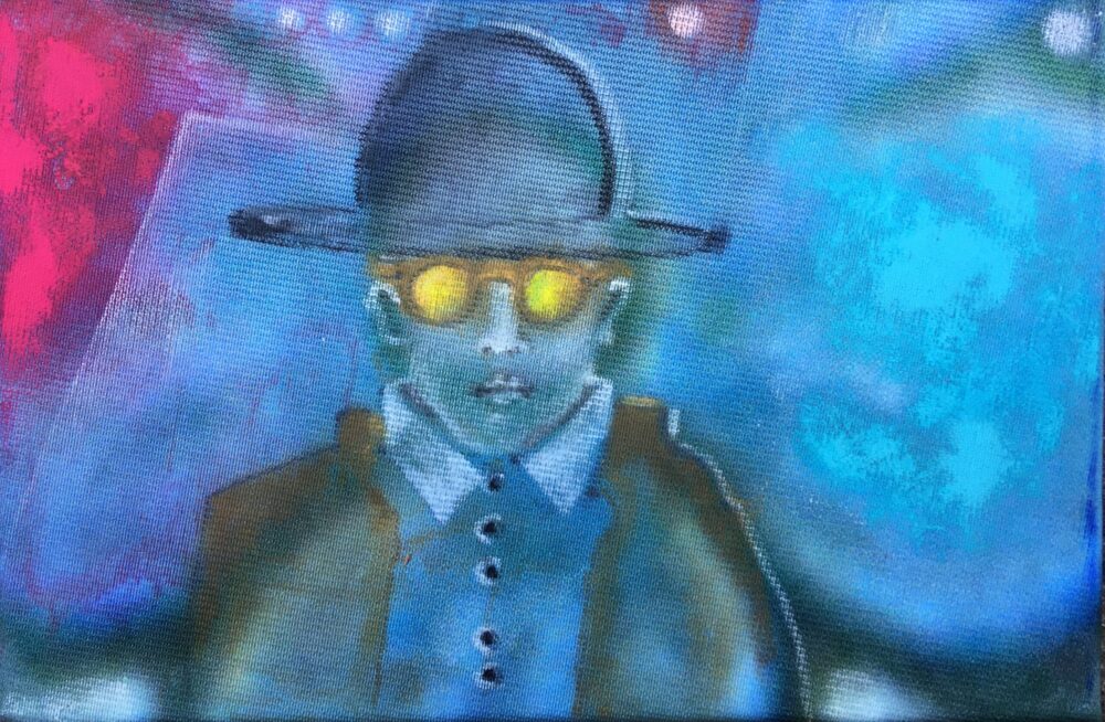 * Traködie Nr. 22 JACK BAKER ON THE WAY TO NIBELUNGEN. Acryl, Gouache, Pigmentkreide auf ein Reststück Tapete, wie sie im Bühnenbild zu AUSSER KONTROLLE verwendet wird. Klassisches Postkarten Format.