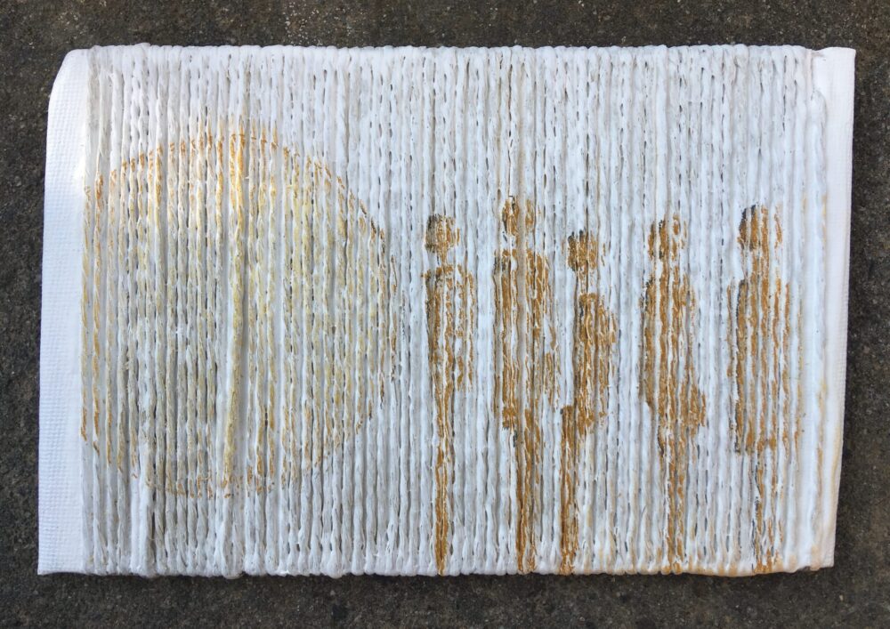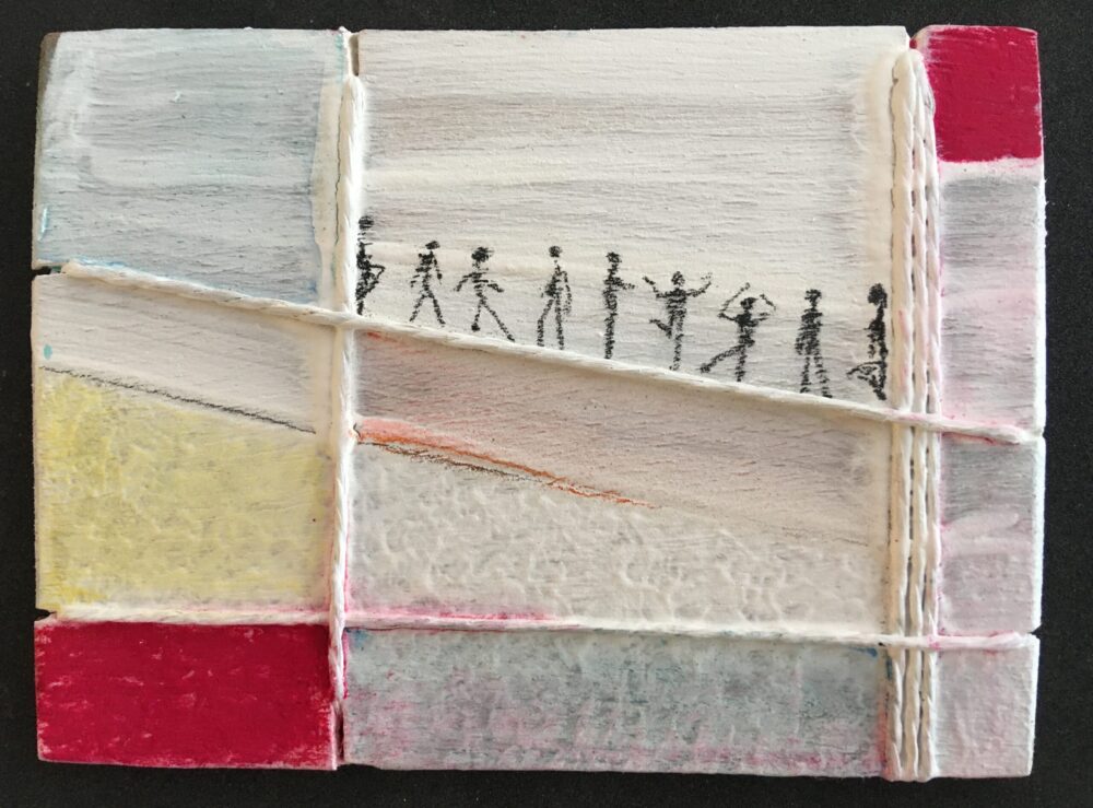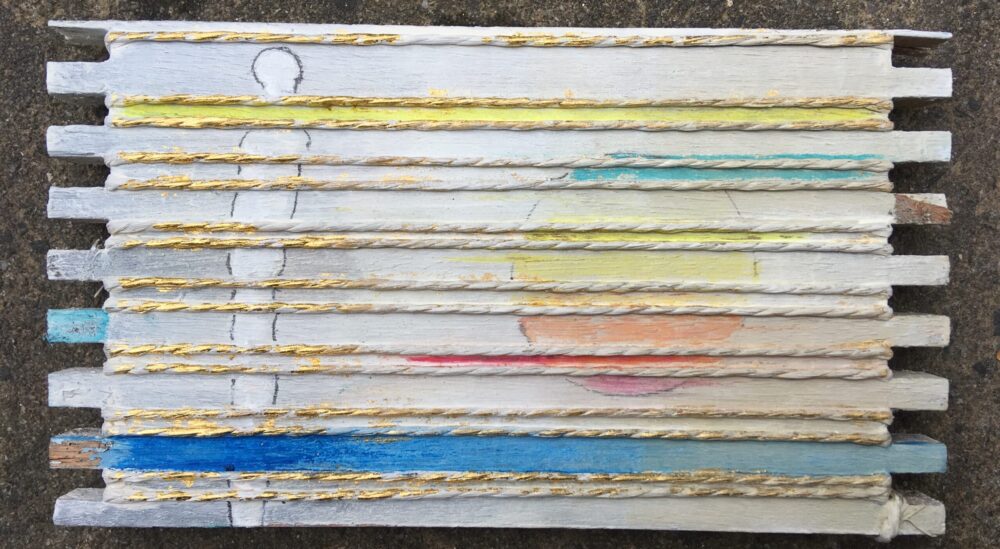 Traködie Nr. 25 Malpappe Postkartengröße umwickelt mit Schnur. Pastelgrundierung, Farbstift.