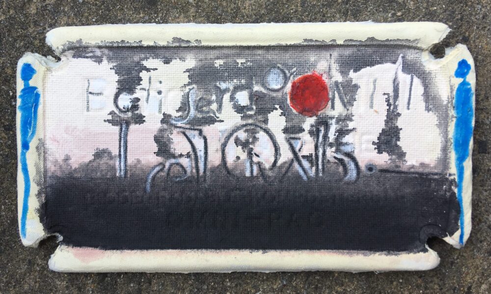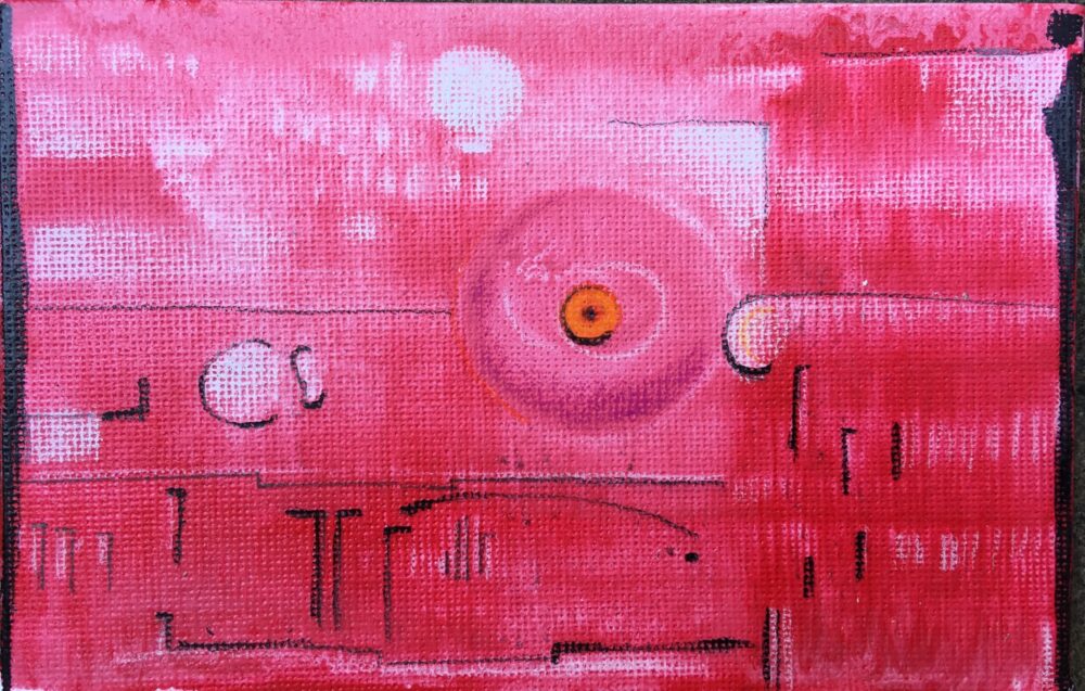 Traködie Nr. 29 Acryl und Pigmentstifte auf den ausgeschnittenen Boden eines Kartons, gestern so im Supermarkt Kirschen gekauft. 11 x 5 cm