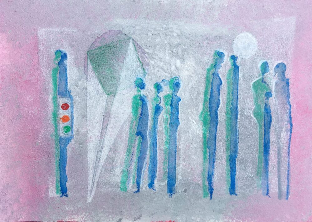 Traködie Nr. 23 Acryl, Gouache, Pigmentkreide. Klassisches Postkarten Format.